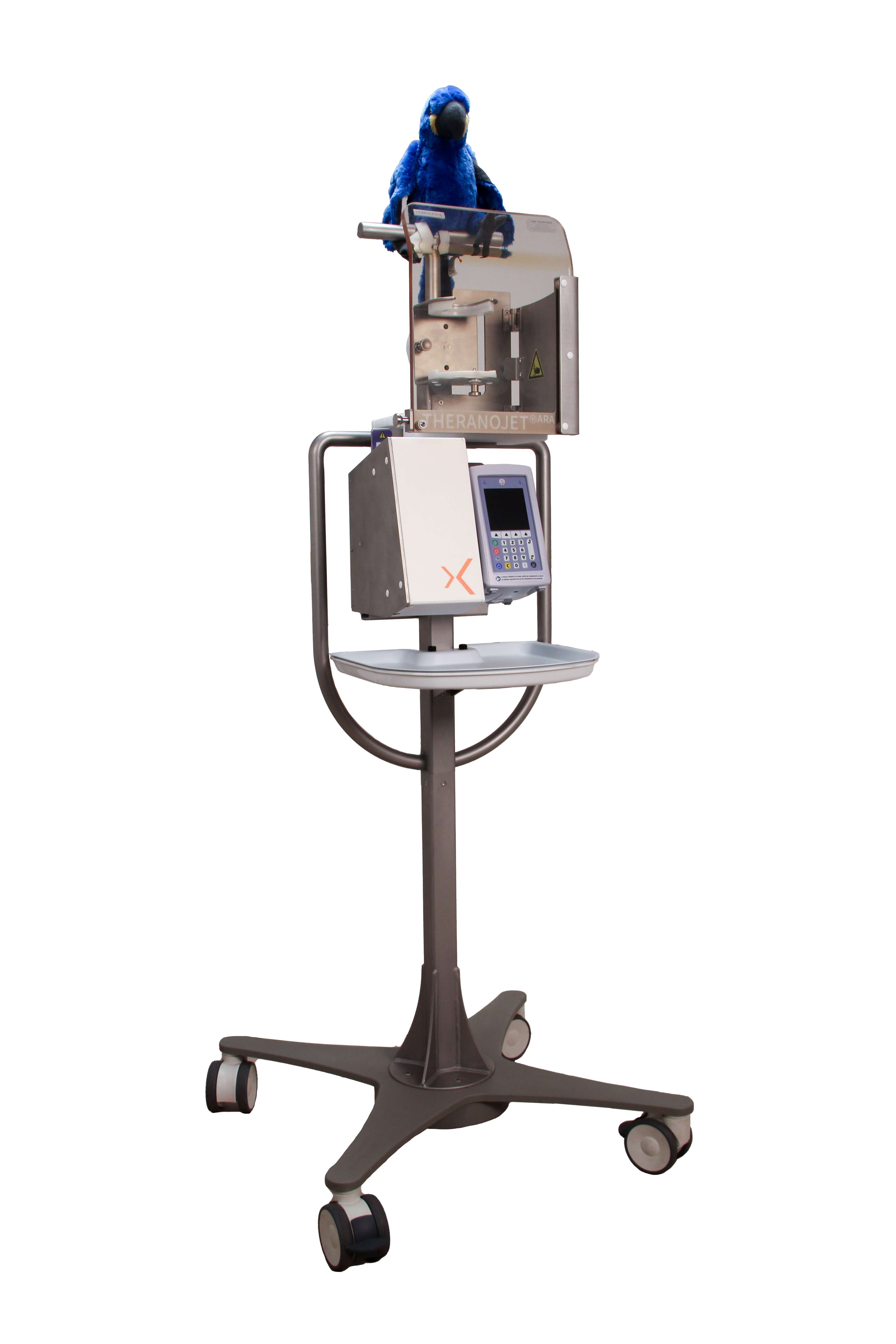 In order to guarantee full safety of the patient during injection and to prevent any risk of extravasation, Theranojet® RIO is equipped with a pump with overpressure and air bubble detectors. This lightweight unit (96 kg) with 4 swivel wheels, is easy to handle and move around. Its two side handles allow it to be moved effortlessly to carry patient doses to the injection cubicles. It is made entirely of stainless steel, and includes a removable containment tray, allowing for simple and quick disinfection and decontamination, when required, without altering the injection unit's components.